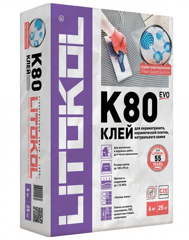 LITOFLEX K80 — сухая клеевая смесь на основе цемента, содержит специальные полимерные, модифицирующие добавки, придающие продукту после полного высыхания эластичность и высокую адгезию на традиционных строительных основаниях. Эластичные свойства LITOFLEX K80 БЕЛЫЙ компенсируют возникающие напряжения между плитками и основаниями при их структурных и температурных деформациях. Клеевой раствор имеет высокую водоудерживающую способность, технологичен, удобен в работе. При облицовке вертикальных поверхностей с помощью LITOFLEX K80 БЕЛЫЙ сползание плитки отсутствует. Клей LITOFLEX K80 БЕЛЫЙ — водо-, морозостойкий. Экологически безопасен, не содержит волокон асбеста.